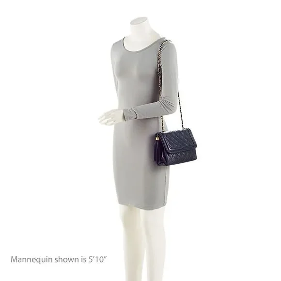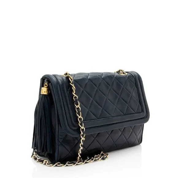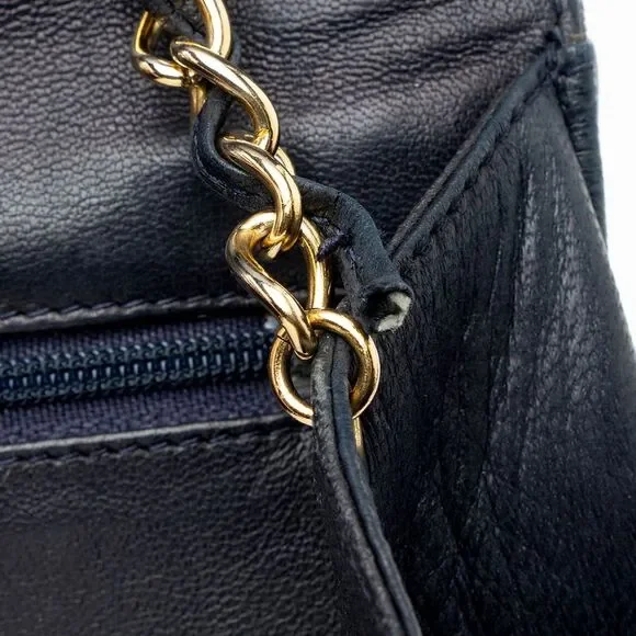 The interlocking CC logo is synonymous with elegance and high French style. Gabrielle "Coco" Chanel first opened a Parisian millinery shop in the early 1900s. By the 1920s she was revolutionizing the world of women's fashion. World-renowned fashion icon Karl Lagerfeld was the creative director from 1983 until his death in 2019. New Creative Director Virginie Viard, had worked alongside Karl for 32 years. The House of Chanel continues to set the standard for designer quality and desirability.Condition: Vintage - Visible scuffs to exterior bottom corners. Scuffs and wear throughout exterior edges and corners. Creasing, imprints, and light scuffs throughout exterior. Surface scratches to hardware. Visible scuffs and wear throughout interior flap. Scuffs and wear throughout interior. Light fading to interior logo. Please note: Read product details carefully. This is a dark blue bag.Material: LambskinOriginal dust bag NOT included, Original box NOT includedShoulder Strap Drop: 18"Origin: ItalyCirca: 1989 - 1991Hardware: Gold ToneClosure: Magnetic SnapPockets: One InteriorLining: Blue Leather