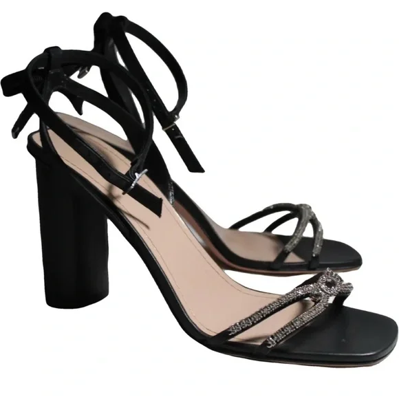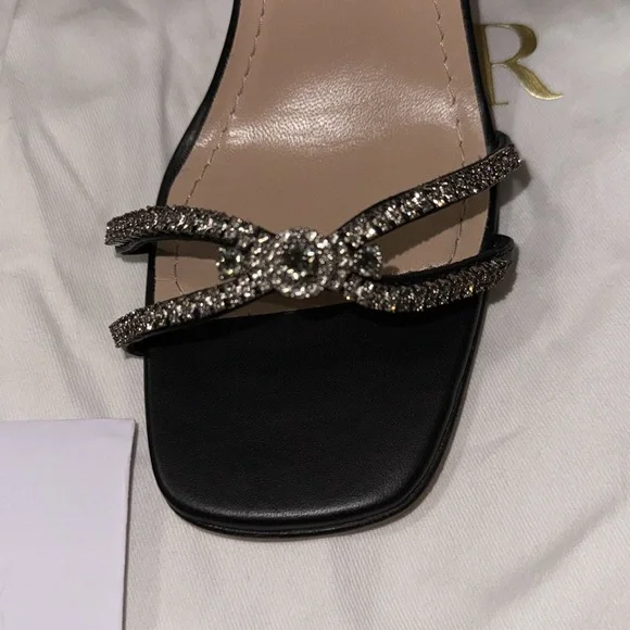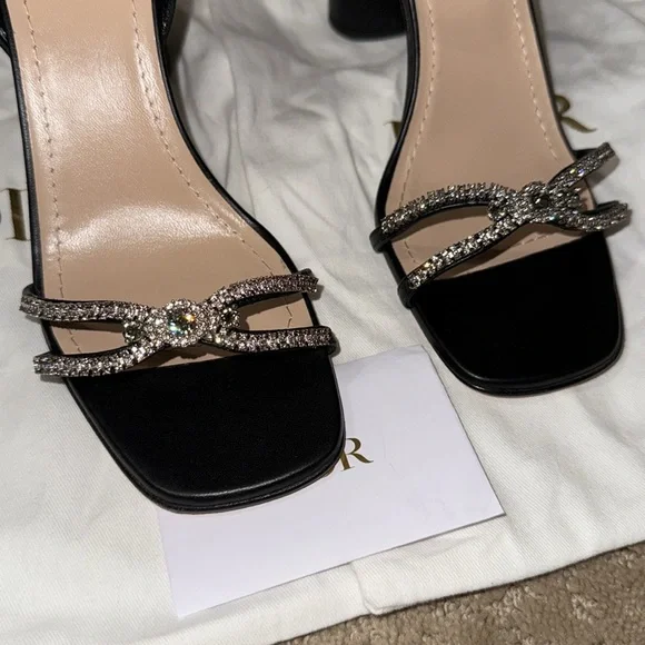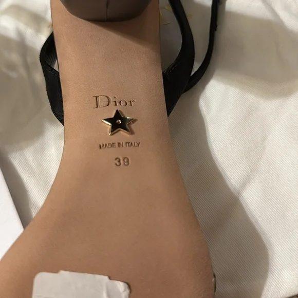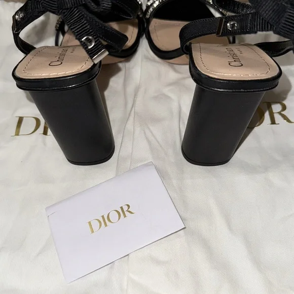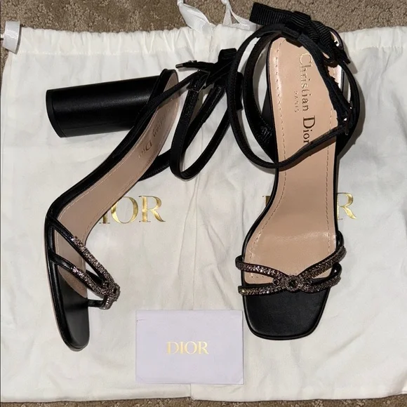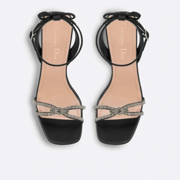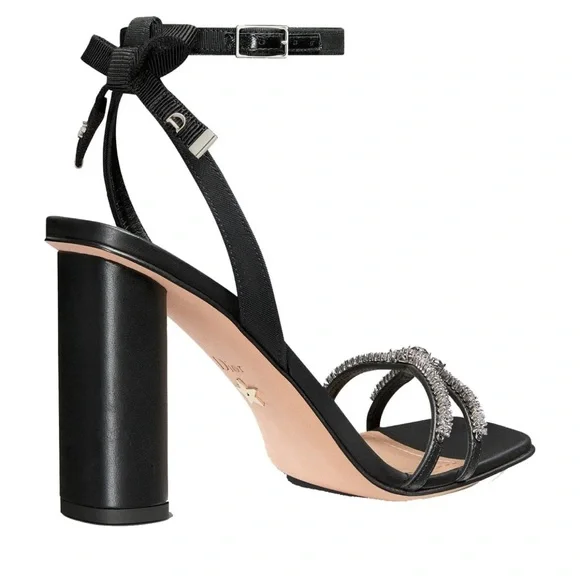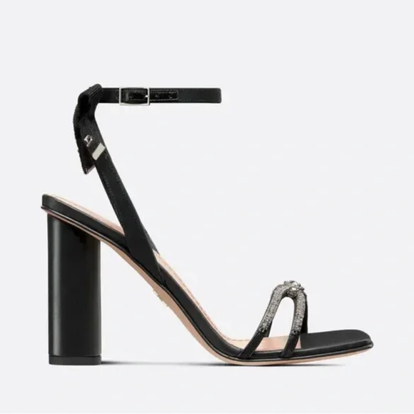 New, the Dior Sunset heeled sandal highlights an elegant and refined silhouette. The front displays delicate black lambskin straps embellished with silver-tone strass, while the ankle strap reveals a grosgrain bow with silver-finish metal C and D initials. Completed by a 10 cm (4) cylindrical heel, the jeweled sandal will illuminate sophisticated attire.- Adjustable buckled ankle strap- Rear bow with silver-finish metal C and D initials- Leather sole with engraved star, Christian Dior's lucky symbol- Made in ItalyMissing box. Comes with dust bags