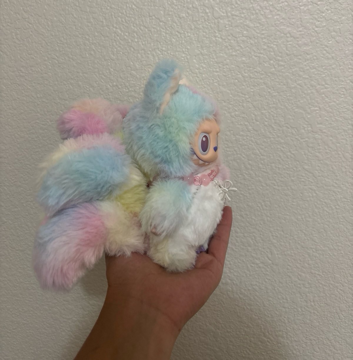 This adorable design captures the charm of the mythical fox with fluffy rainbow fur, purple sparkling eyes , and multiple tails. I feel like big into energy LUCK with 9 tails.