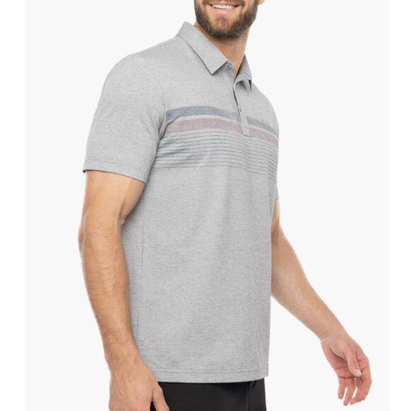 - Sun-faded stripes span the chest of a polo that keeps you moving day and night in the comfort of breathable cotton-enhanced piqué.